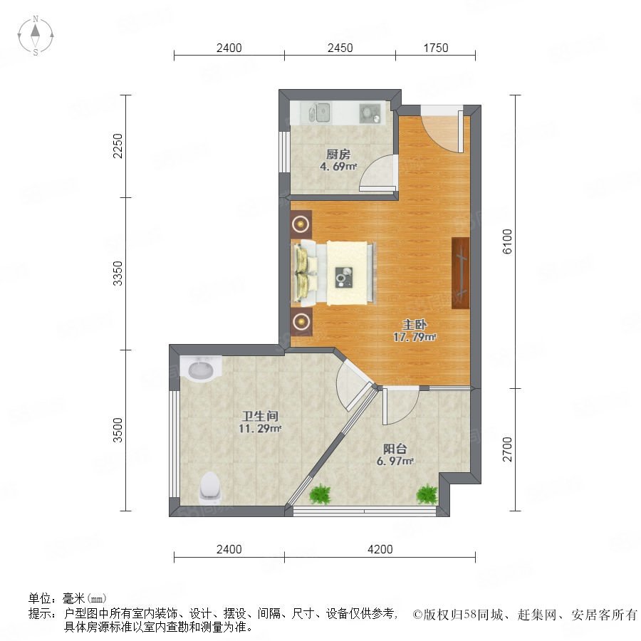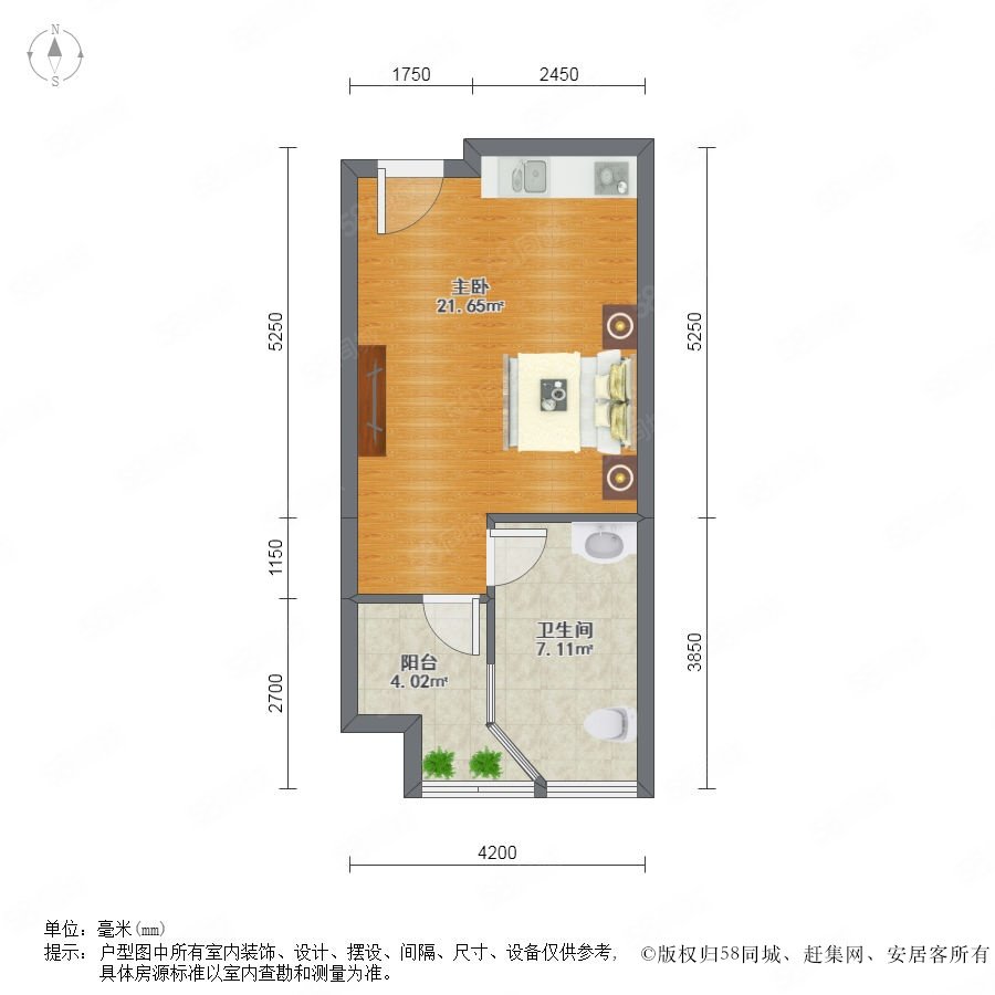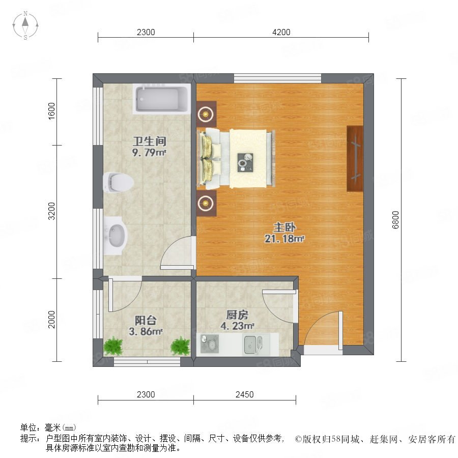 1室0廳1衛(wèi) 57m2