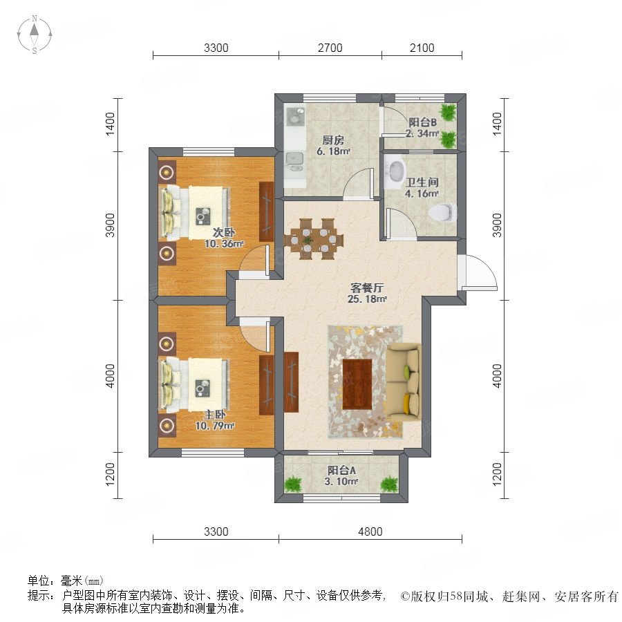 2室2廳1衛(wèi) 88m2
